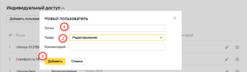 - Введите логин Яндекса или email пользователя, которому нужно открыть доступ.