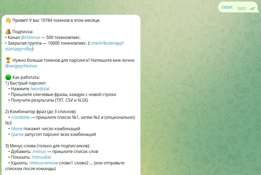 ParserKEY — быстрый сбор фраз из Вордстата прямо в Telegram. Расширенные команды для комбинирования фраз. Быстрая работа.
